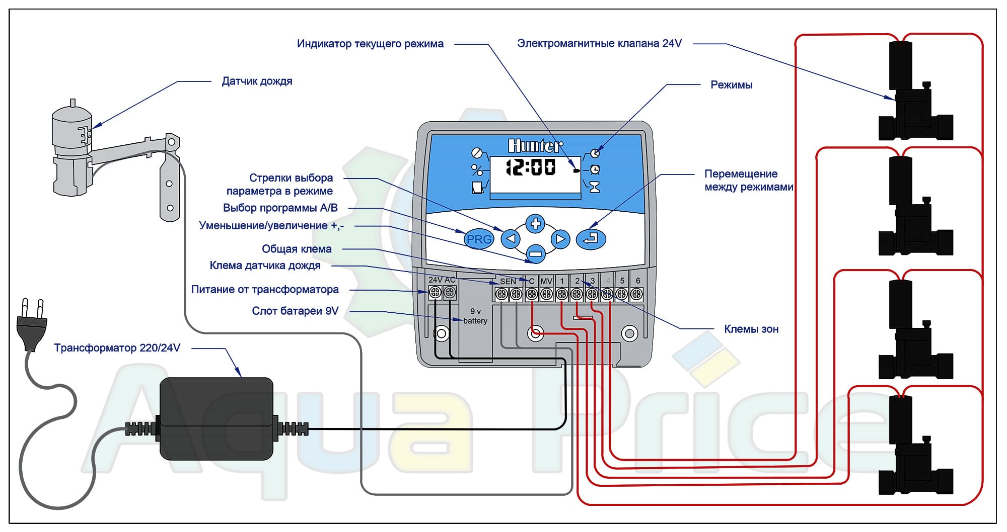 - Кнопки-стрелки (вправо-влево) перемещают между параметрами внутри режима (выбор зон, стартов полива, часы, дата, и т.д.).