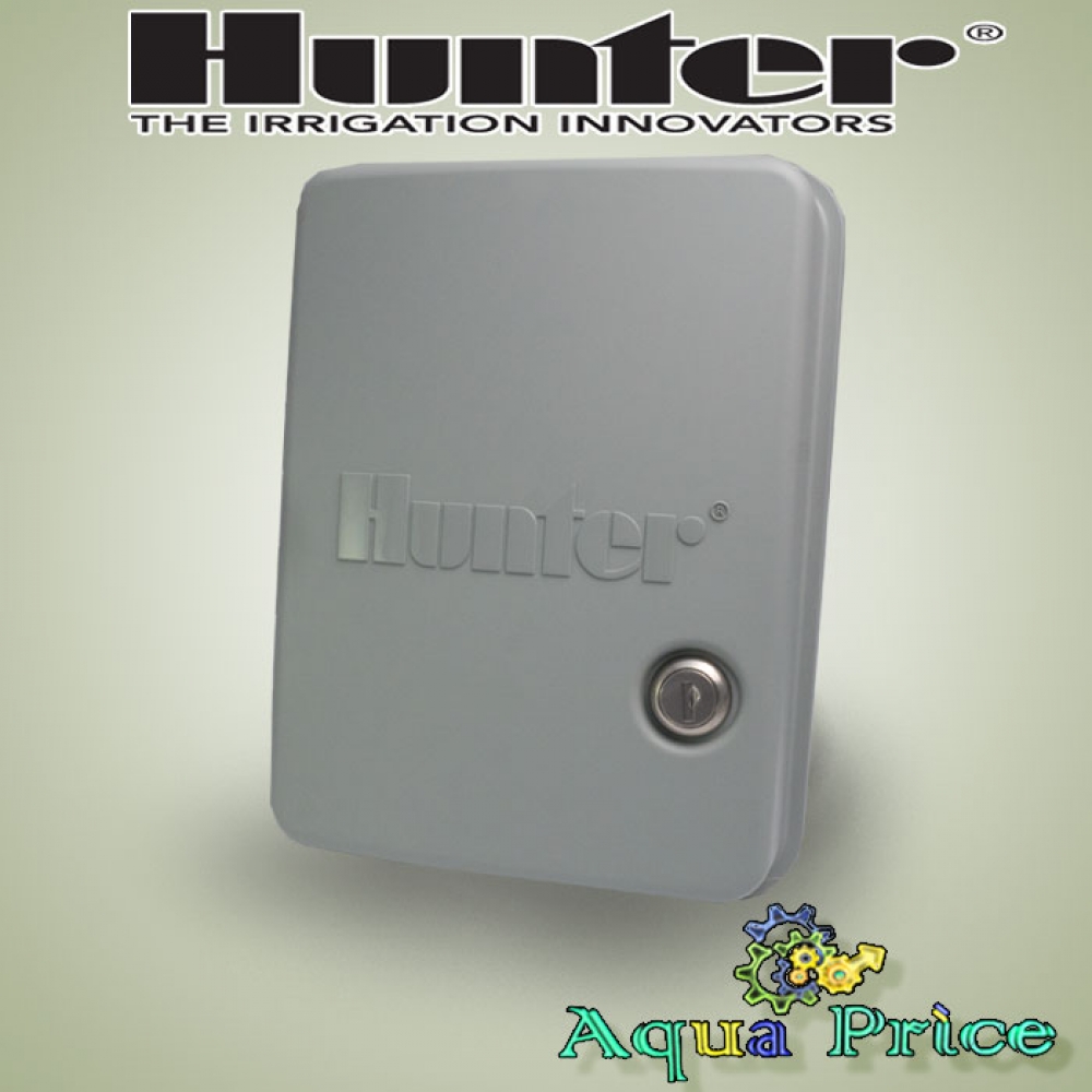 Автономный пульт управления питается стандартно от сети и может автономно запускаться от 6 щелочных батареек AA, поддерживая бесперебойную работу системы орошения в случае отключения электричества. Контроллер Hunter для управления поливом предлагается в специальном пластмассовом боксе, который препятствует воздействию неблагоприятных погодных явлений. Конструктивно состоит из следующих элементов:
