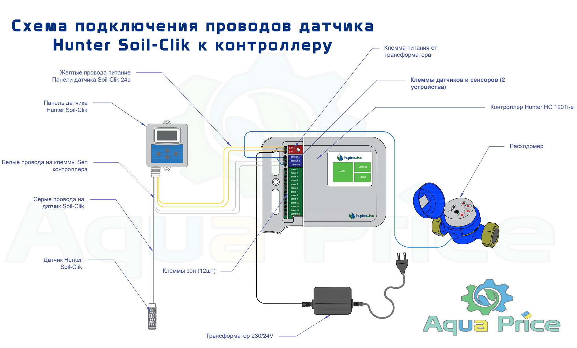 Подключение проводов датчика Hunter Soil-Clik к контроллеру