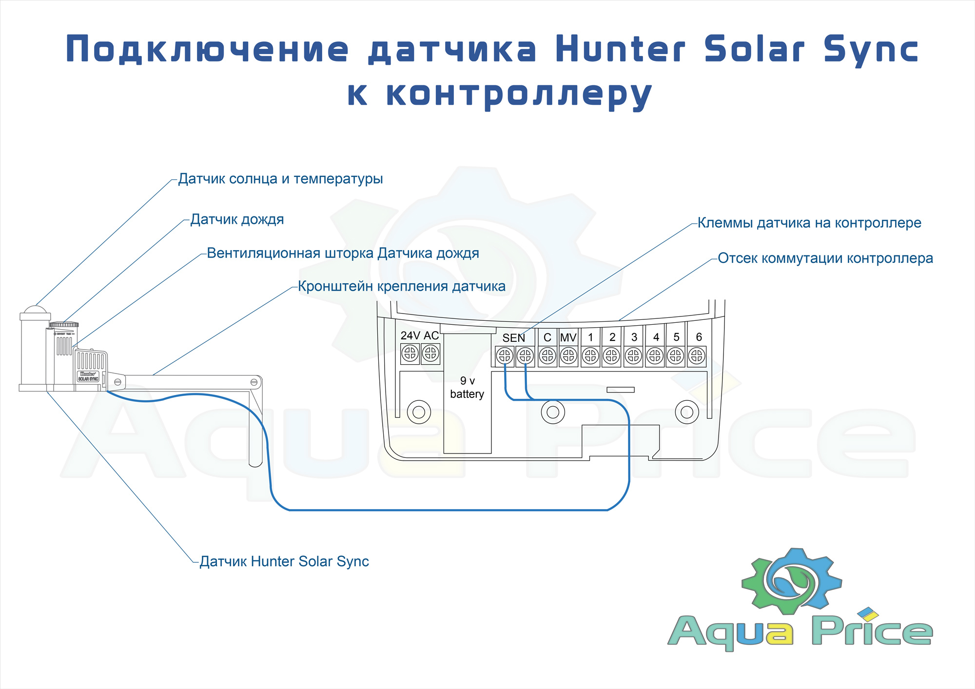 - Датчик Hunter Solar Sync солнечной синхронизации включает два чувствительных компонента, решая две задачи, исключая установку дополнительных приборов.