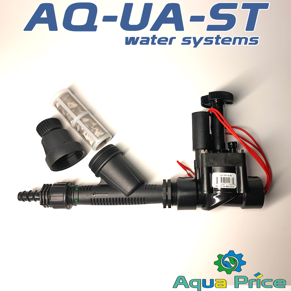 Пусковой комплект AQ-UA-ST PCZ-101-TECO-25 для капельного полива включает электромагнитный клапан Hunter PGV 101 и редуктор с сетчатым фильтром TECO на 2,5 Bar.