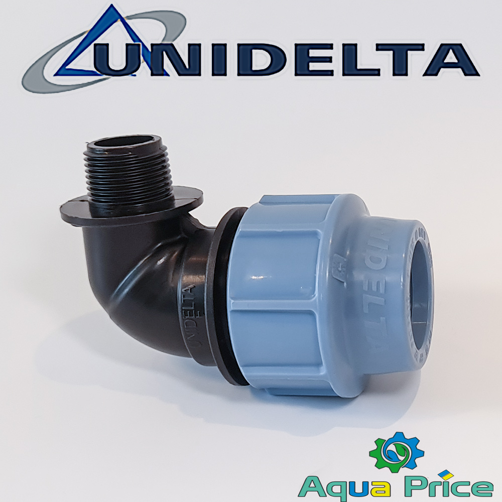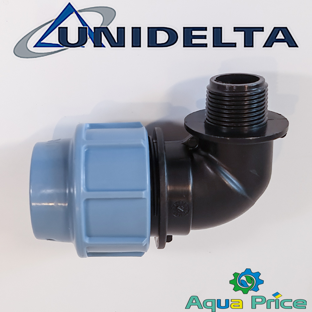Угол 40-1" НР Unidelta ПЭ компрессионный для ПНД труб - это поворотный фитинг, предназначенный для соединения полиэтиленовых труб (ПНД) в системах водоснабжения, полива Хантер или газопроводах. Произведенный итальянской компанией Unidelta.