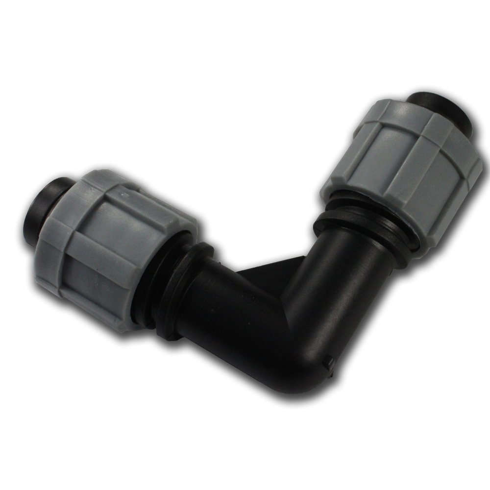 Колено для соединения двух отрезков капельной ленты под углом 90°. Применяется в системах капельного орошения, как на обширных полях, так и на небольших участках.