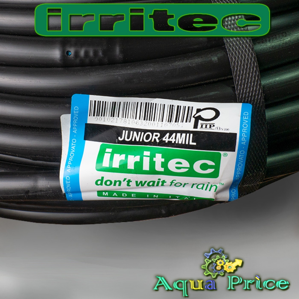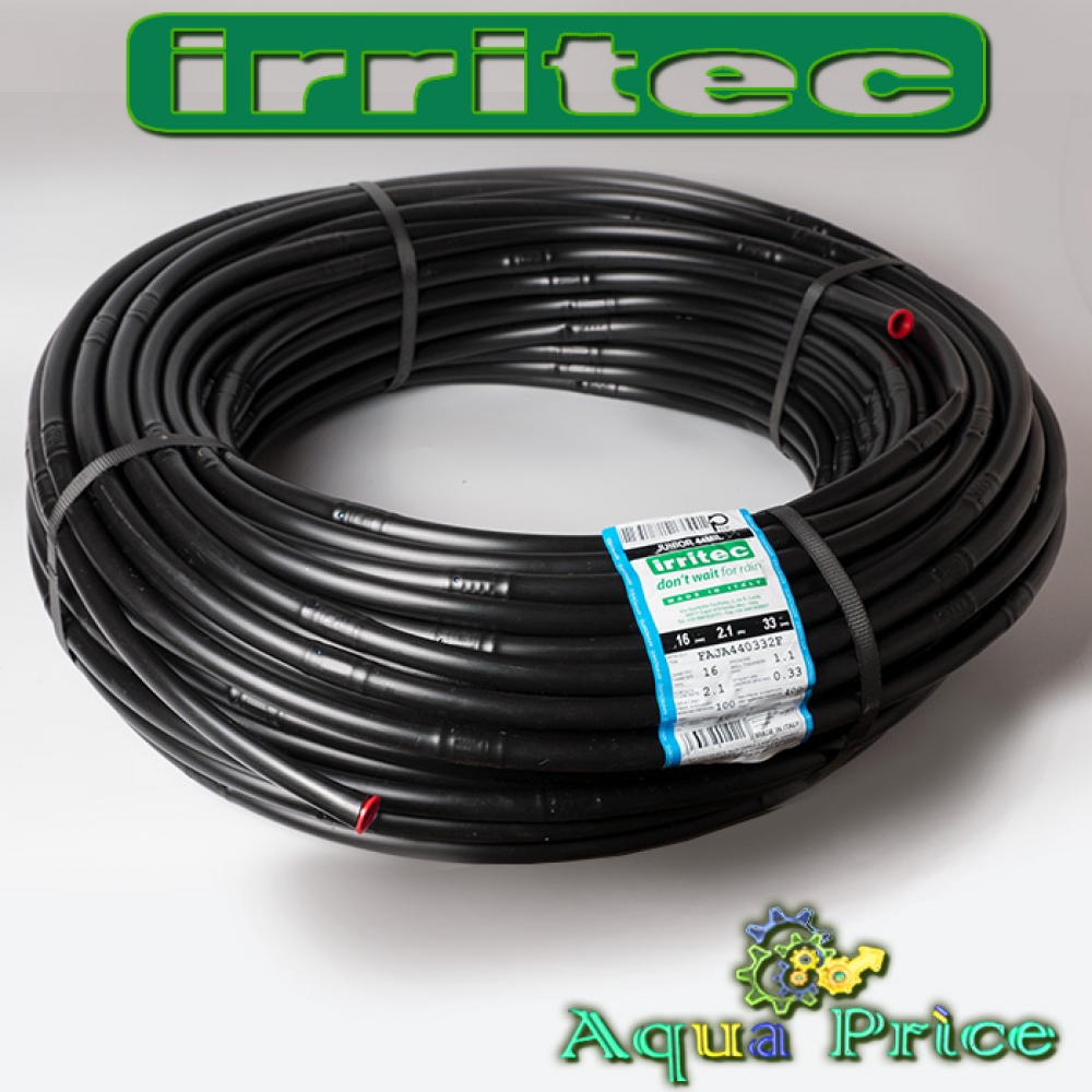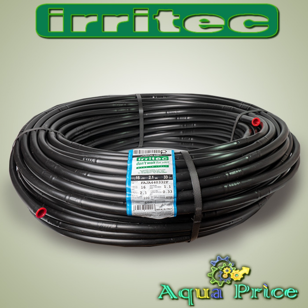 Капельная трубка Irritec внешне напоминает поливочный шланг чёрного цвета со встроенными капельницами, имеющими калиброванные отверстия. Орошение происходит через эмиттеры, расположенные с интервалом 33 см. Различают 2 исполнения шлангов: с некомпенсированными капельницами, где расход воды прямо зависит от давления (Junior), и компенсированными эмиттерами (Multibar), универсален и стоит дороже. В них встроена силиконовая мембрана, регулирующая стабильность расхода вне зависимости от напора в системе полива, удалённости точки от водоисточника.