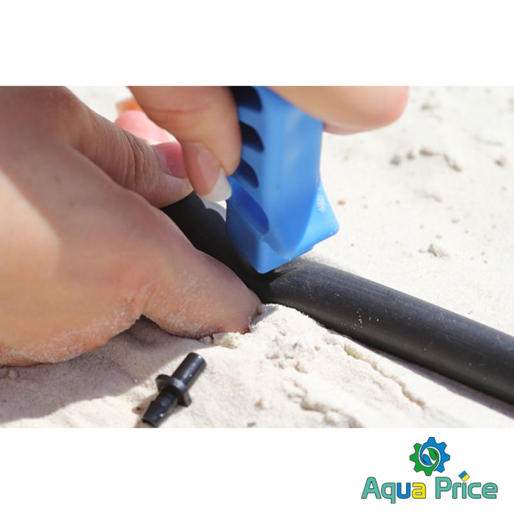 Используя его, берут слепую трубку, затем располагают её, исходя из того, как на участке расположены растения. Рядом с каждым, используя дырокол 3 мм Presto-PS (модель SP-0103), проделывают отверстия в оснащении. Закончив, располагают внутри фитинги, капельницы, прочие аксессуары.