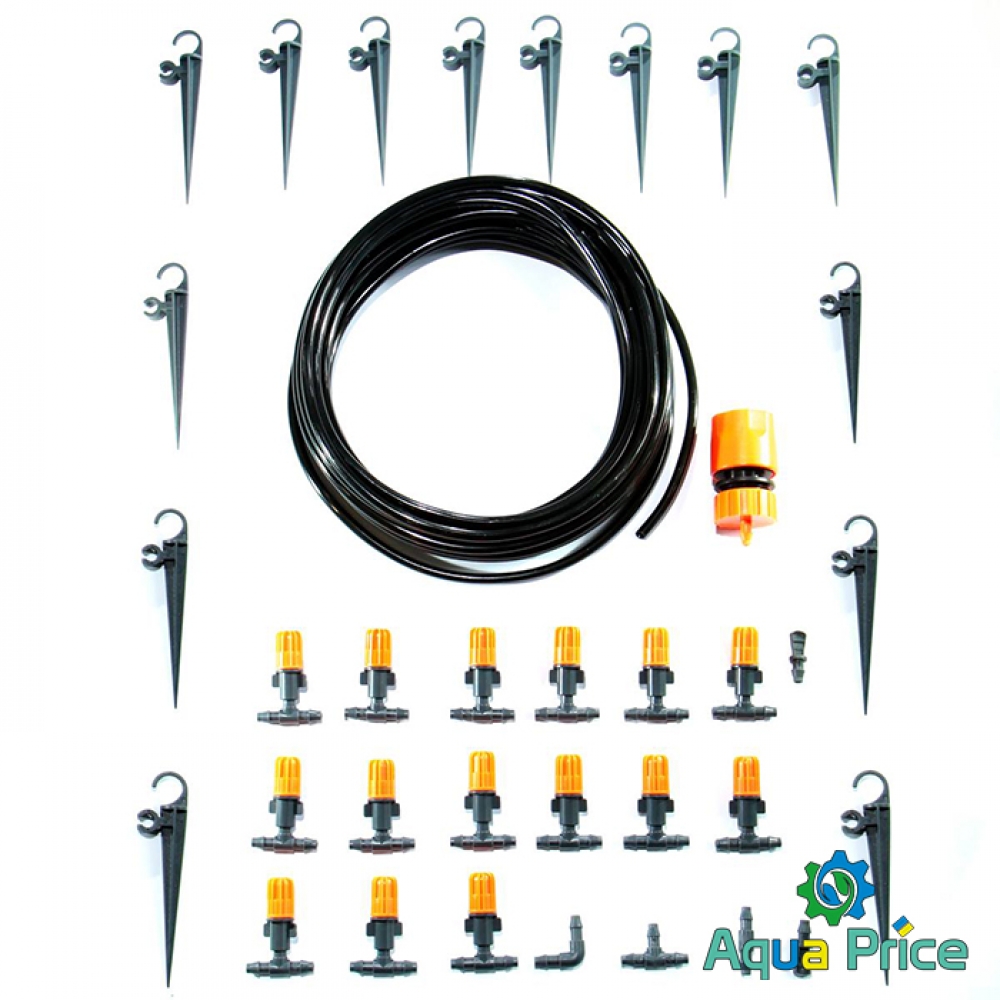 Составные части набора изготовлены из высококачественного пластика, который прослужит Вам не один сезон. В набор включены 15 распыляющих форсунок, которые охватывают до двух метров расстояния (по кругу). Расставлять форсунки можно также рядом с беседками - для увлажнения воздуха и сбивания пыли. Капельное орошение огорода способствует меньшей затрате времени на полив, благоприятствует лучшему росту и защищает от солнечных лучей. При установке наборы в теплицах или парниках вы спасаете растения от чрезмерно высоких температур и сохраняете необходимый уровень влажности воздуха.