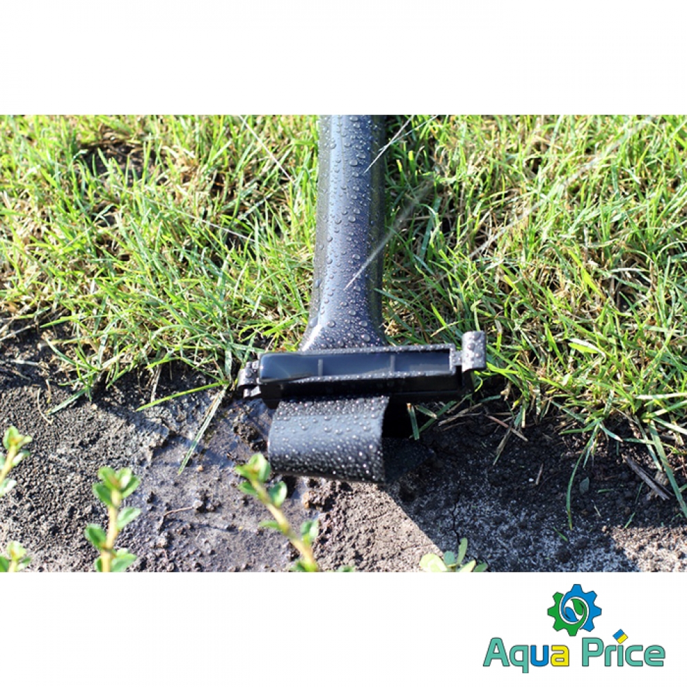 - Натянуть ленту и зафиксировать заглушку в земле.