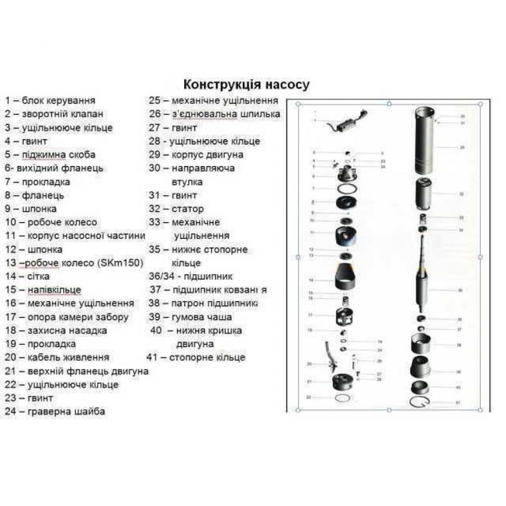 Насос 4SKm состоит из однофазного электродвигателя с масляным охлаждением, предназначенного для работы под водой и насосной части с 2-мя рабочими колесами вихревого типа.