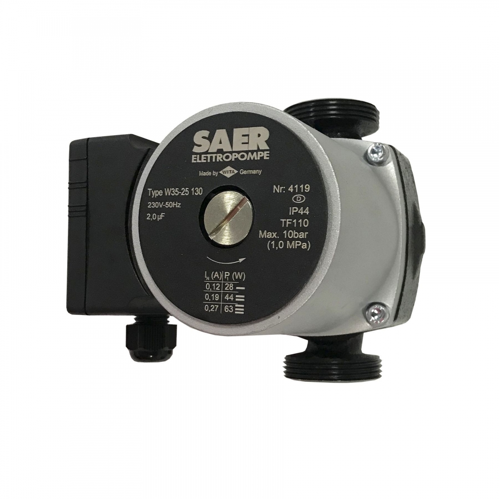 Циркуляционный насос SAER W35-25 130мм - это циркуляционный однофазный насос с «мокрым ротором» и регулируемой скоростью предназначенный для применения в отопительных системах закрытого типа с принудительной циркуляцией или в системах с открытым расширительным баком.