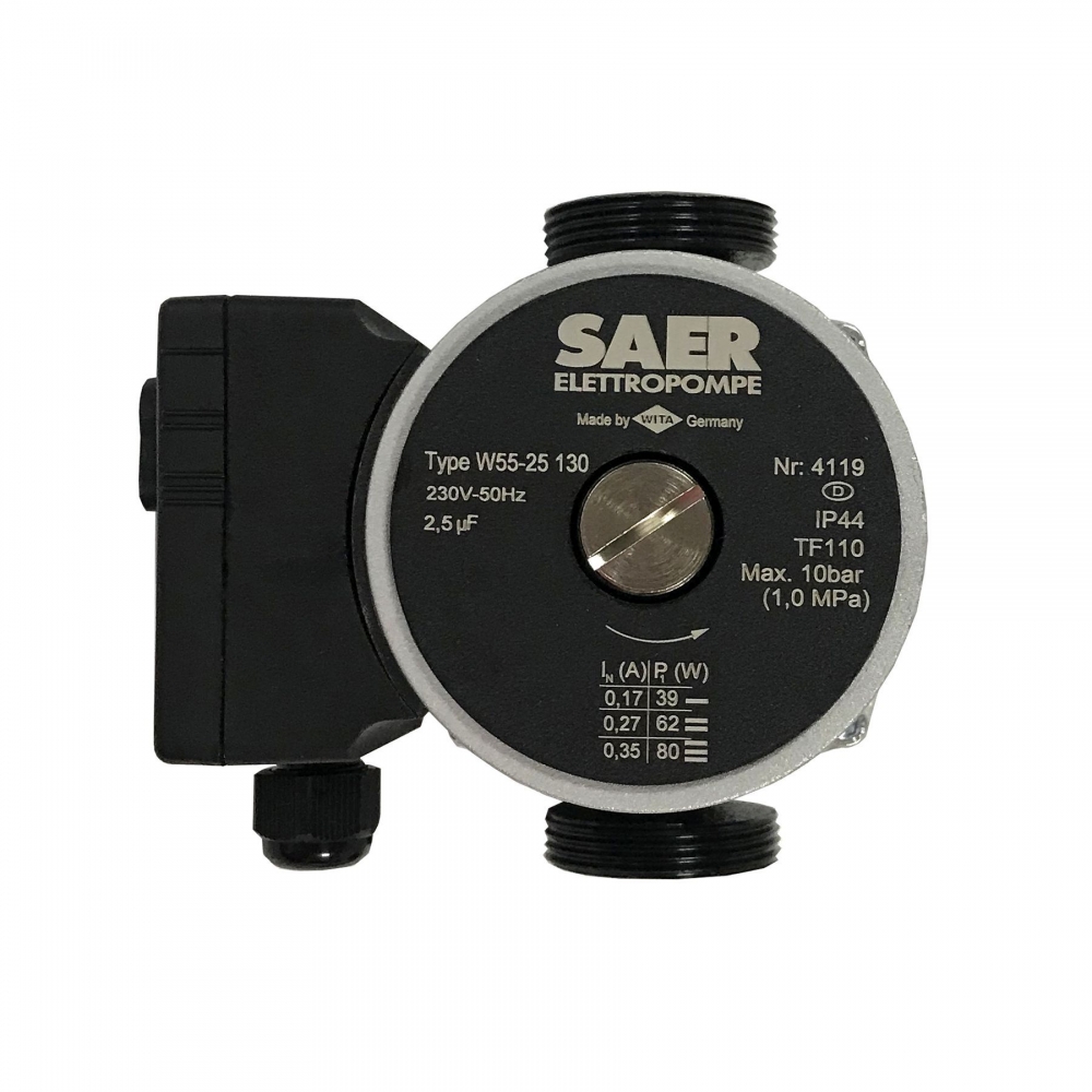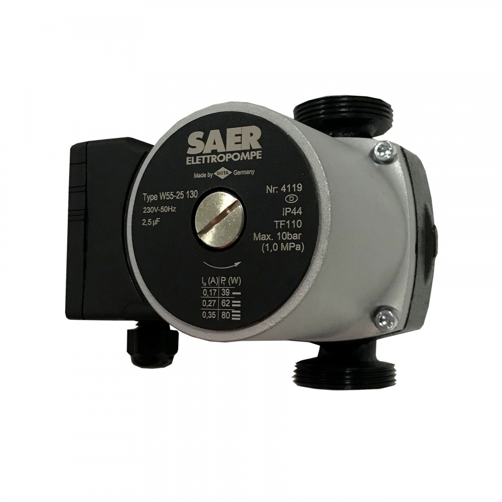 Циркуляционный насос SAER W55-25 130мм - это циркуляционный однофазный насос с «мокрым ротором» и регулируемой скоростью предназначенный для применения в отопительных системах закрытого типа с принудительной циркуляцией или в системах с открытым расширительным баком.