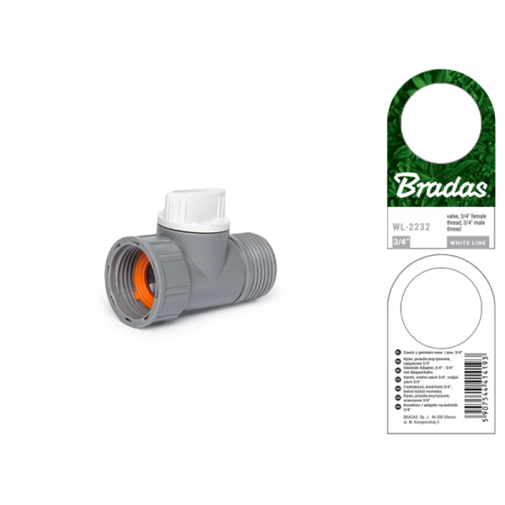 Кран запорный для системы полива выполнен в белом и сером цветах, что является визитной карточкой соединительной и поливочной арматуры серии WHITE LINE от Bradas.