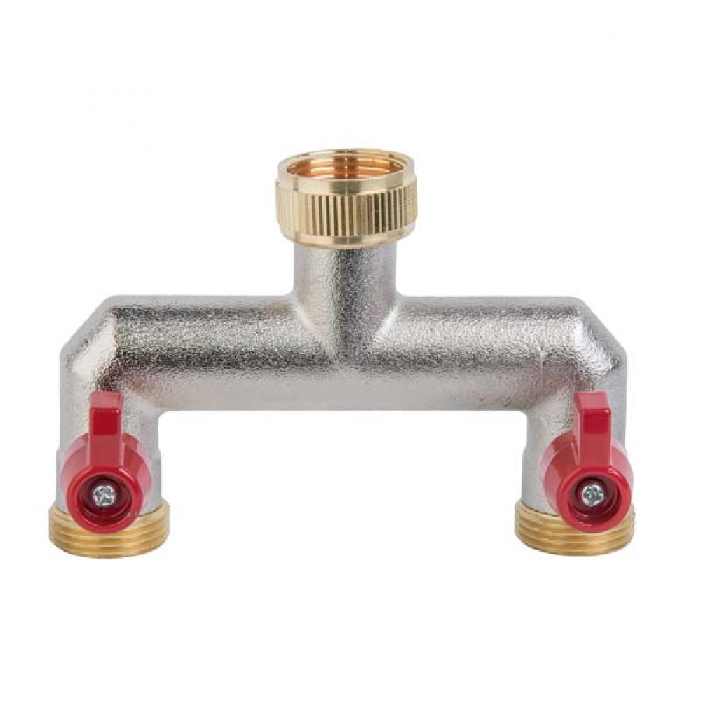 Тройник имеет одну внутреннюю резьбу 3/4" и два шаровых крана с наружной резьбой 3/4" для соединения с адаптерами для быстросъемных соединений. (BR-2134)