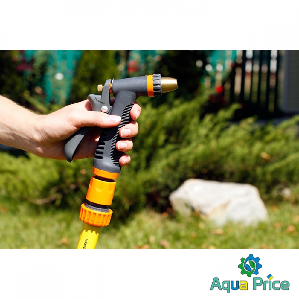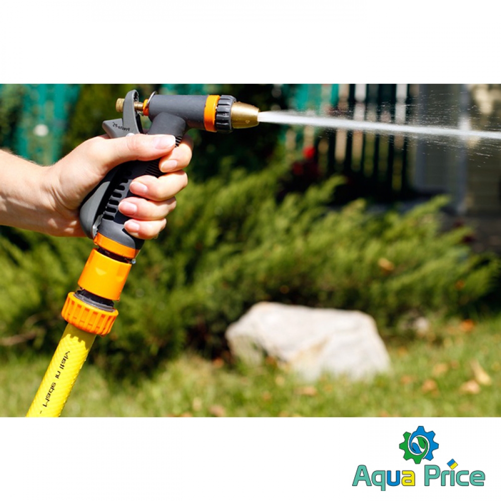 Пистолет для полива Presto-PS (7206) используется для ручного полива газонов средней и небольшой площади, огородов, цветников, уборки дорожек на придомовой территории, мытья садового инвентаря и техники. Поворотная головка пистолета имеет 3 положения и регулирует форму струи и степень распыления воды. Возможные режимы работы: струя, конус, туман. Подключается к садовым шлангам диаметром 1/2, 5/8 и 3/4 дюйма при помощи стандартных коннекторов. Рекомендуемое рабочее давление в системе от 2 до 5 атмосфер. Изготовлен поливочный пистолет из металла, долговечный, стойкий к механическим повреждениям, воздействию ультрафиолета и водорастворимых удобрений. Форсунка из латуни для увеличения срока службы пистолета.