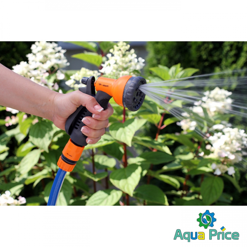 Пистолет для полива Presto-PS (7202) используется для ручного полива газонов средней и небольшой площади, огородов, цветников, уборки дорожек на придомовой территории, мытья садового инвентаря и техники. Поворотная головка пистолета имеет 8 положений и регулирует форму струи и степень распыления воды. Возможные режимы полива: мягкая струя, мелкие струи, угловой, проливной дождь, душ, туман, плоский горизонтальный, конус. Подключается к садовым шлангам диаметром 1/2, 5/8 и 3/4 дюйма при помощи стандартных коннекторов. Рекомендуемое рабочее давление в системе от 2 до 4 атмосфер. Изготовлен поливочный пистолет из качественного пластика, долговечный, стойкий к механическим повреждениям, воздействию ультрафиолета и водорастворимых удобрений.