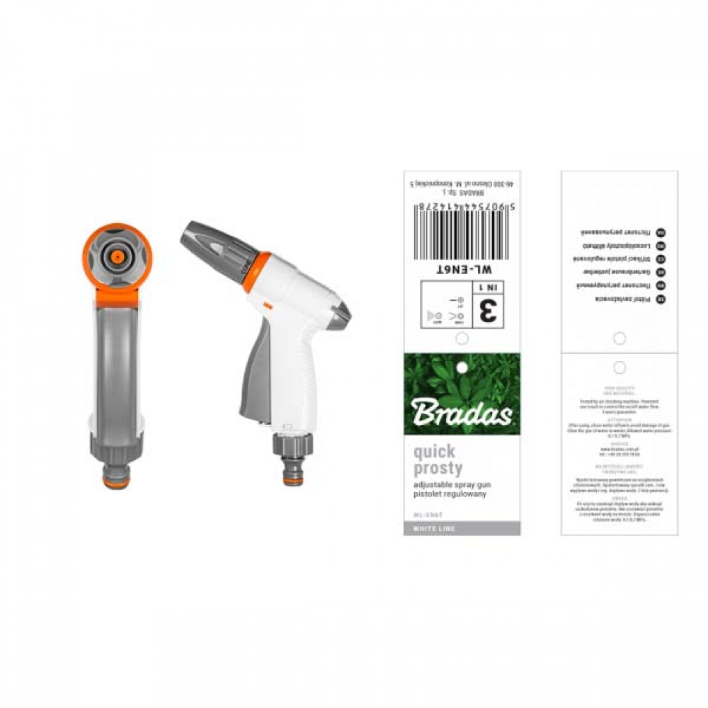 Поливочный пистолет QUICK PROSTY выполнен в белом и сером цветах, что является визитной карточкой соединительной и поливочной арматуры серии WHITE LINE от Bradas.