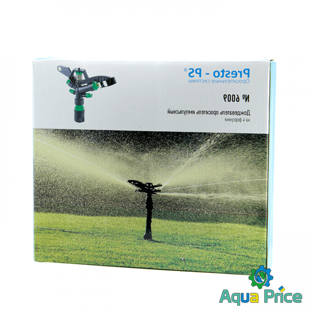 Дождеватель импульсный на 4 форсунки Presto-PS (6009) используется для орошения участков большой площади, для полива одного гектара земли их достаточно установить 5-6 штук в зависимости от формы участка. Оптимально подойдут для огородов, газонов и для футбольных полей. В отличии от других видов эти дождеватели подают воду короткими импульсами с небольшим временным интервалом, встроенный маятниковый механизм разбивает струю на части и создает эффект близкий к естественному дождю. Данная модель покрывает участок круглой формы до 36 метров в диаметре, максимальная площадь орошения 1020 м^2. Расход воды при давлении 5 атмосфер до 6 м^3/час. Количество форсунок - 4. Возможно подключение как к гибкому садовому шлангу с установкой на переносную треногу, так и стационарная установка на магистральную трубу с помощью фитингов с наружной резьбой 25 мм (1"). Рекомендуемое рабочее давление в системе от 3 до 5 атмосфер. Изготовлен дождеватель из высококачественного, стойкого к воздействию ультрафиолетового излучения и удобрений пластика. При производстве используются только первичные материалы.