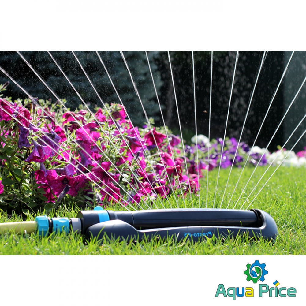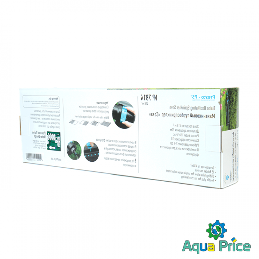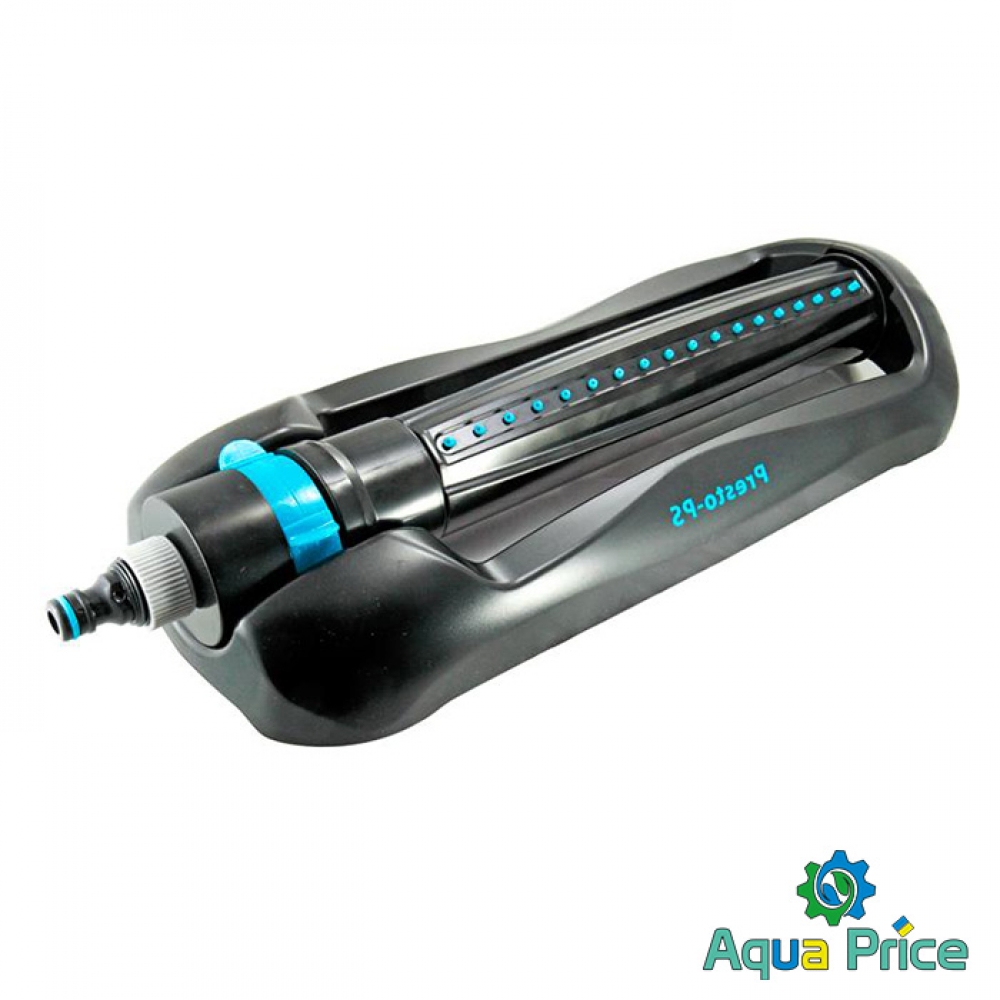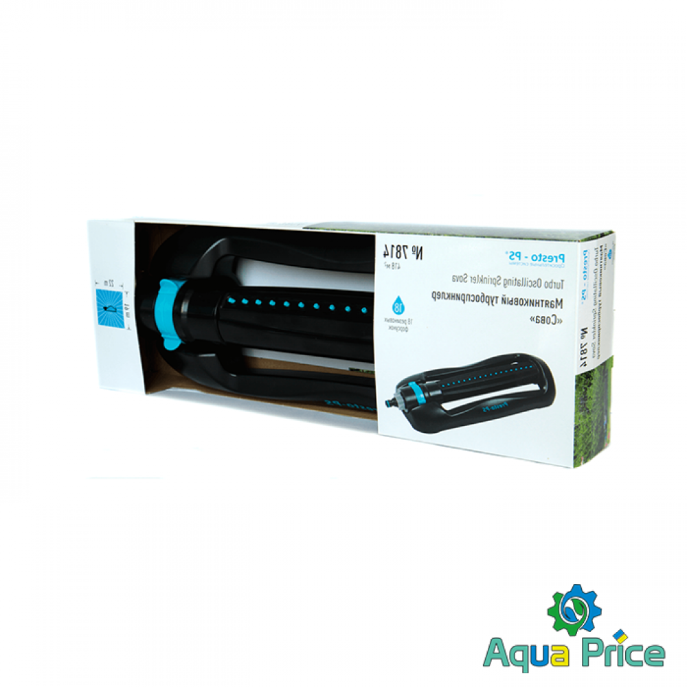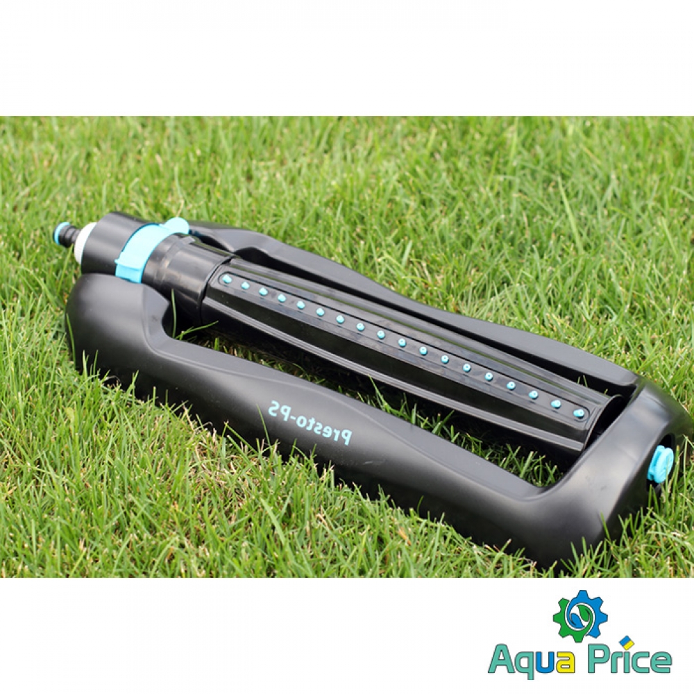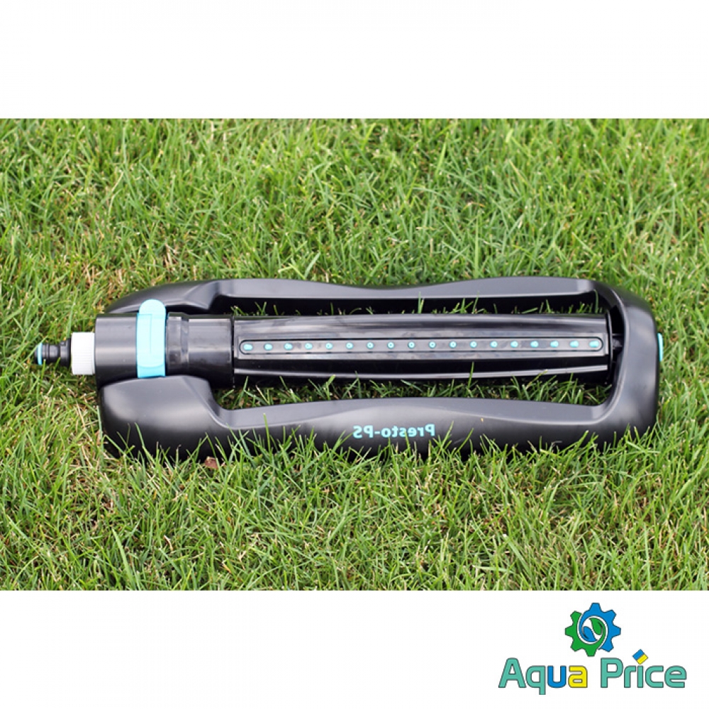 Дождеватель осциллирующий Presto-PS Сова (7814) используется для орошения средних и небольших газонов, подойдет так же и для полива огорода. Эти дождеватели разбрызгивают воду через 18 форсунок тонкими струями имитируя естественный мелкий дождь и обрабатывают прямоугольный сектор 14 х 17 метров площадью до 238 м2. В конструкции дождевателя используется долговечный автоматический запатентованный турбомотор с применением уникальных композитных материалов работающий от воды проходящей через него. Ширина полива легко регулируется при помощи ползунков на корпусе дождевателя. Рабочее давление 2-4 атмосферы. Расход воды при давлении 2 атмосферы до 0,8 м^3/час. Для продления срока службы дождевателя рекомендуется использование в системе подачи воды фильтра грубой очистки. Сопла изготовлены из резины и легко чистятся комплектной иглой для форсунок. Подключается ороситель к садовым шлангам диаметром 1/2, 5/8 и 3/4 дюйма при помощи стандартных коннекторов.