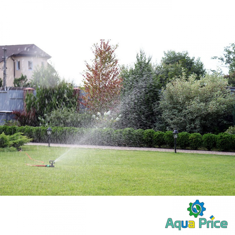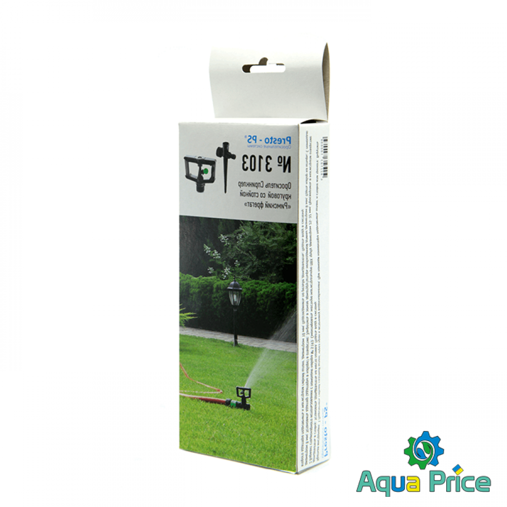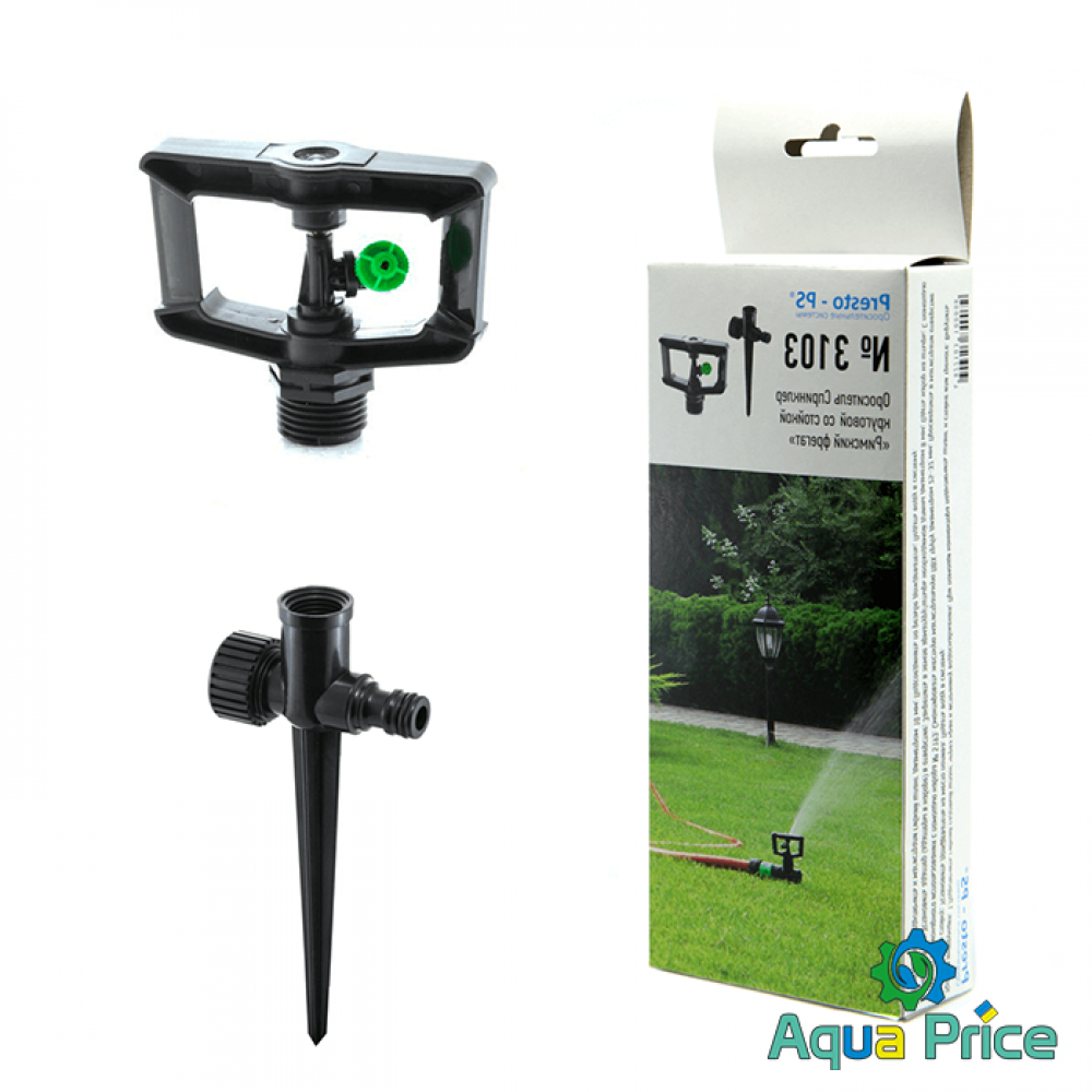 Дождеватель круговой Presto-PS регулируемый Римский фрегат (SP-3103) используется для орошения газонов средней и небольшой площади, подойдет так же и для полива огорода или теплицы. Эти дождеватели разбрызгивают воду тонкими струями, имитируя естественный мелкий дождь, и обрабатывают сектор участка захватом 360° при диаметре покрытия до 12 метров. Максимальная площадь полива составляет 113 м^2. Особенностью данной модели является форсунка с регулировкой по высоте подачи струи от -8o до 25o. Форсунка дождевателя съемная. что позволяет быстро и просто прочистить её при необходимости. А наличие тормозной системы оси из силикона даёт возможность дождевателю поддерживать режим медленного вращения в 1 оборот за 45 секунд для обеспечения более равномерного орошения. Возможно подключение как к гибкому садовому шлангу с установкой на комплектной ножке или переносной треноге, так и стационарная установка на магистральную трубу с помощью фитингов с внутренней резьбой 12 мм (1/2"). Рекомендуемое рабочее давление в системе от 1,5 до 3 атмосфер. Расход воды при давлении 2 атмосферы до 0,2 м^3/час. Изготовлен дождеватель из качественного ПВХ, долговечный, стойкий к воздействию ультрафиолета и водорастворимых удобрений. Для увеличения срока эксплуатации изделия рекомендуется установка фильтра на подающую магистральную трубу.