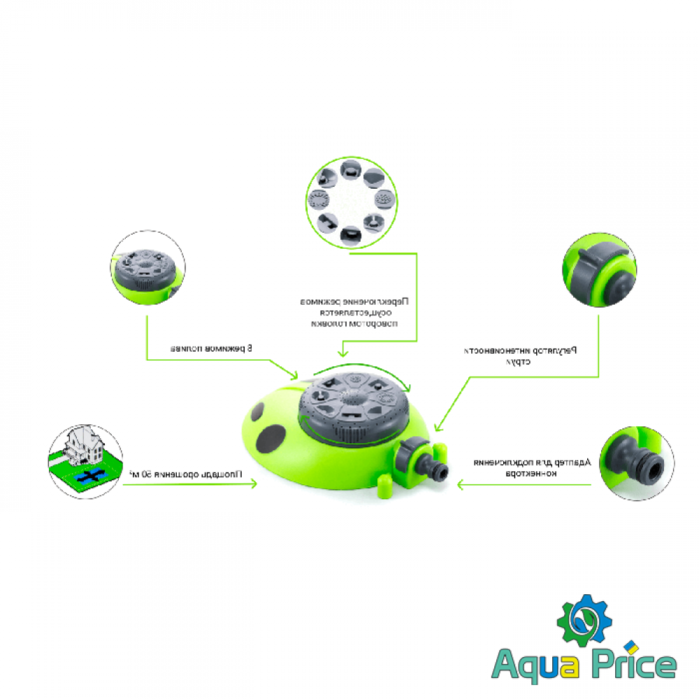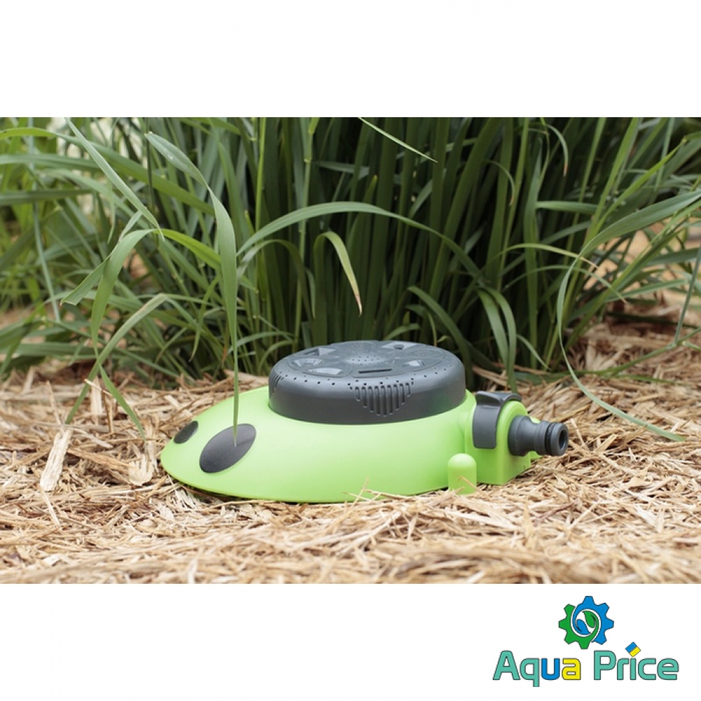 Дождеватель многофункциональный Presto-PS Божья коровка (8112G) используется для орошения газонов средней и небольшой площади, подойдет так же для полива огорода и придомовой территории. Эти дождеватели универсальны и хорошо подойдут для участков со сложной геометрией и смешанной растительностью. Поворотная головка дождевателя с разными видами форсунок позволяет выбрать форму орошаемого сектора и вид распыления из 8 типов. Возможные режимы полива: круговой / секторный / квадратный / прямоугольный / туман / четверть круга / треугольный / плоский. Дополнительно оснащен регулятором подачи воды на входе для изменения интенсивности полива. Подключается к садовым шлангам диаметром 1/2, 5/8 и 3/4 дюйма при помощи стандартных коннекторов. Минимальный диаметр полива 2 метра, максимальный 8 метров. Площадь полива составляет до 50 м^2. Рекомендуемое рабочее давление в системе от 2 до 4 атмосфер. Расход воды при давлении 2 атмосферы до 0,8 м^3/час. Изготовлен дождеватель из качественного пластика, долговечный, стойкий к воздействию ультрафиолета и водорастворимых удобрений.