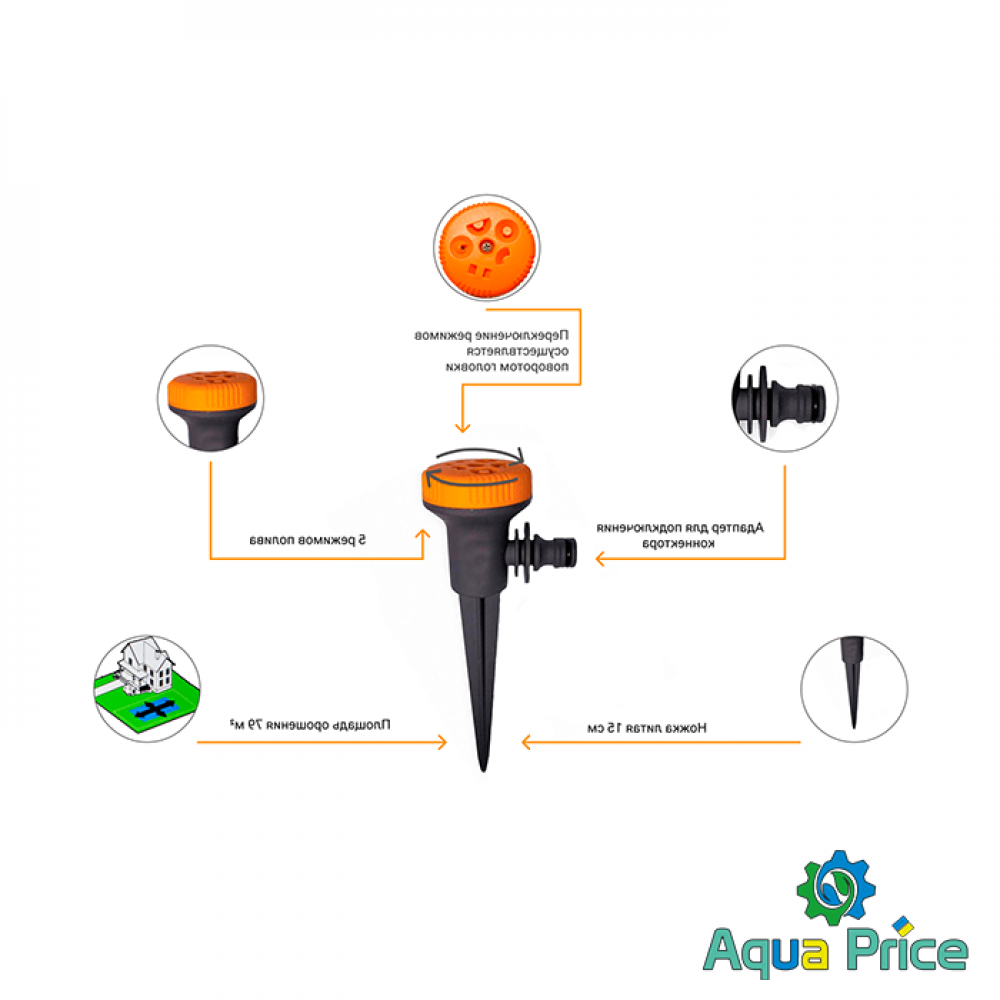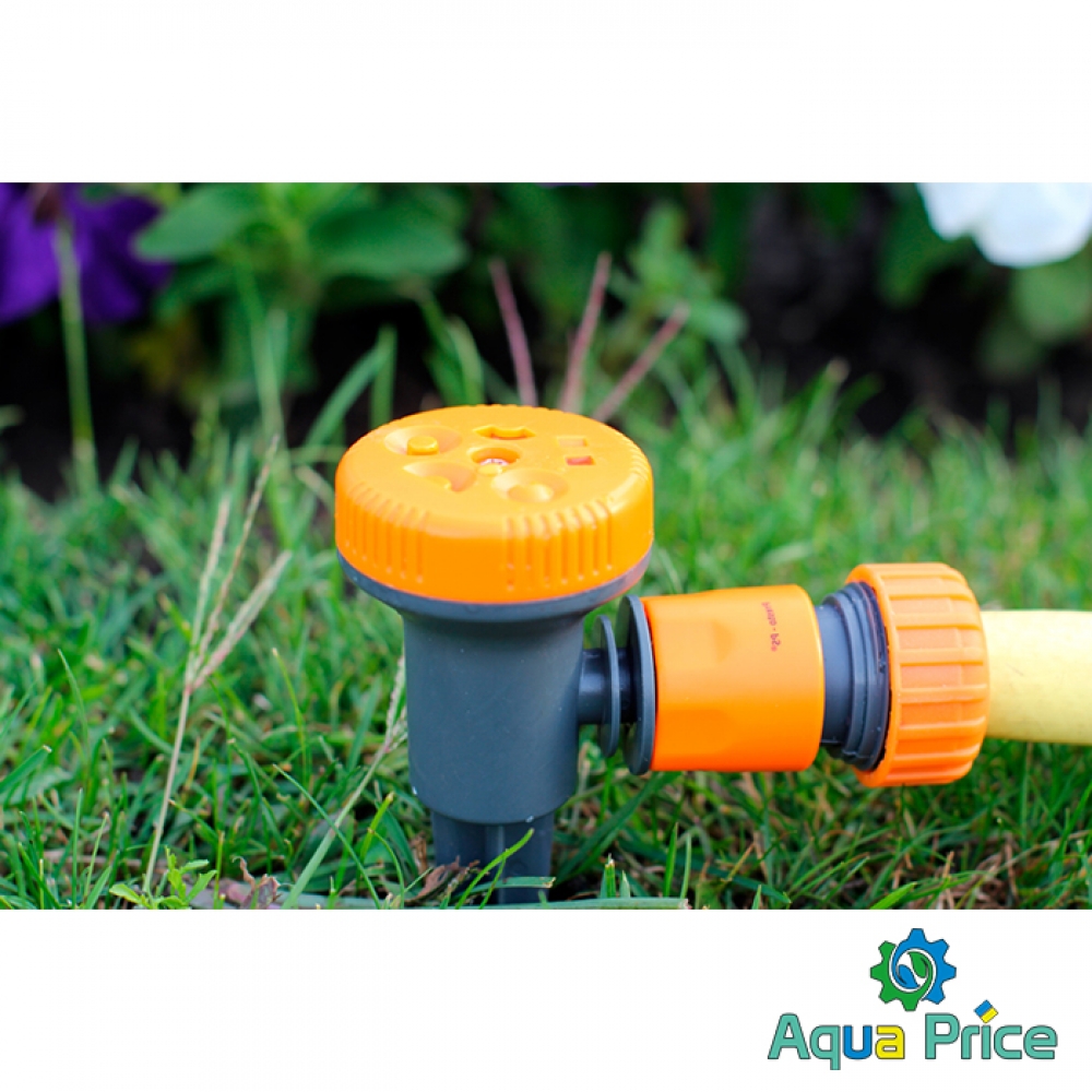 Дождеватель многофункциональный Presto-PS Грибок (8108) используется для орошения газонов средней и небольшой площади, подойдет так же для полива огорода и придомовой территории. Эти дождеватели универсальны и хорошо подойдут для участков со сложной геометрией и смешанной растительностью. Поворотная головка дождевателя с разными видами форсунок позволяет выбрать форму орошаемого сектора и вид распыления из 5 вариантов. Возможные режимы полива: круговой, секторный, прямоугольный, треугольный, плоский. Подключается к садовым шлангам диаметром 1/2, 5/8 и 3/4 дюйма при помощи стандартных коннекторов. Минимальный диаметр полива 5,5 метров, максимальный 10 метров. Площадь полива составляет до 79 м^2. Рекомендуемое рабочее давление в системе от 2 до 4 атмосфер. Расход воды при давлении 2 атмосферы до 0,6 м^3/час. Изготовлен дождеватель из качественного пластика, долговечный, стойкий к воздействию ультрафиолета и водорастворимых удобрений.