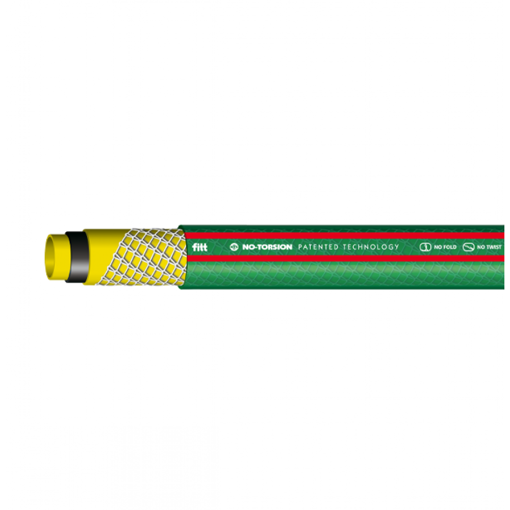 Шланг поливочный пятислойный. Армирован прочной полиэстеровой оплеткой инновационной системы NTS® (Non-Torsion System), которая предотвращает перекручивание и заламывание шланга. Шланг изготовлен из высококачественного эластичного ПВХ. Устойчив к негативному воздействию UV излучения и интенсивному нарастанию водорослей внутри шланга (дополнительный черный слой).