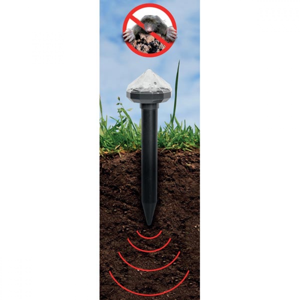 Оснащен белым светодиодом, который управляется датчиком сумерек. Отпугиватель кротов, мышей и различных грызунов. Имеет встроенную солнечную батарею и эффективен для участков радиусом 15 м.