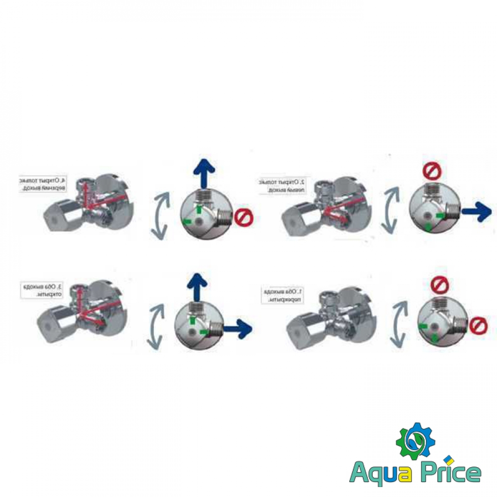 Полуповоротный кран не предназначен для регулировки напора воды, поэтому каждый его выход или подключается напрямую к водопроводной сети, или полностью перекрывается. Для удобства пользователей на поворотной рукоятке крана нанесены метки, однозначно определяющие текущий режим его работы.