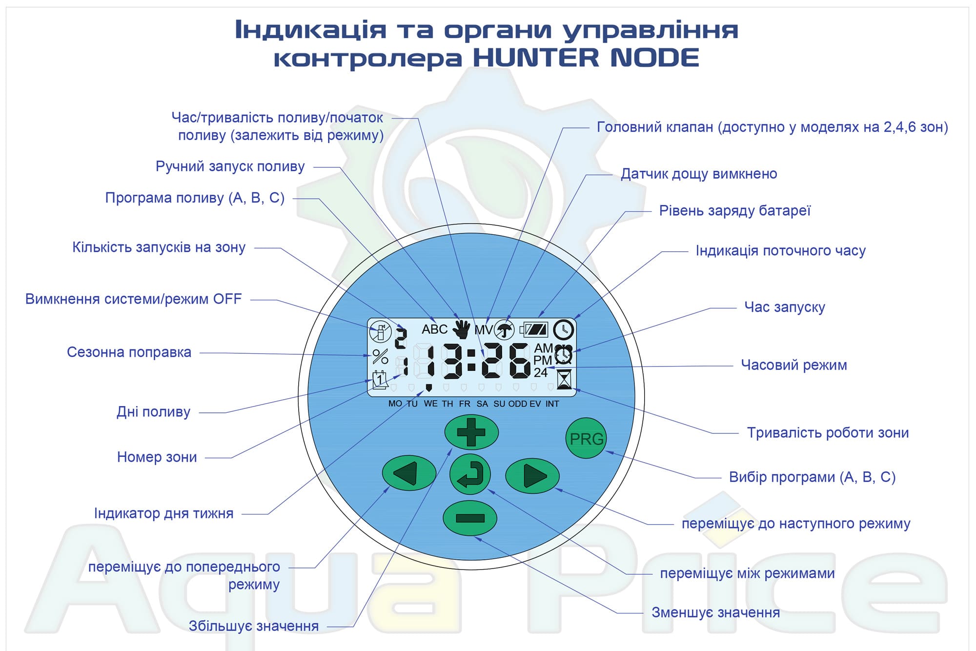 Продуманий конструктив та вологонепроникна оболонка контролера полегшують складний монтаж обладнання та його управління. Є дисплей на рідких кристалах, що дозволяє налаштовувати режими включення клапанів у системі поливу. Контролер програмує три окремі режими (A,B,C) з чотирма запусками.