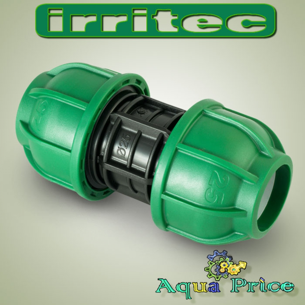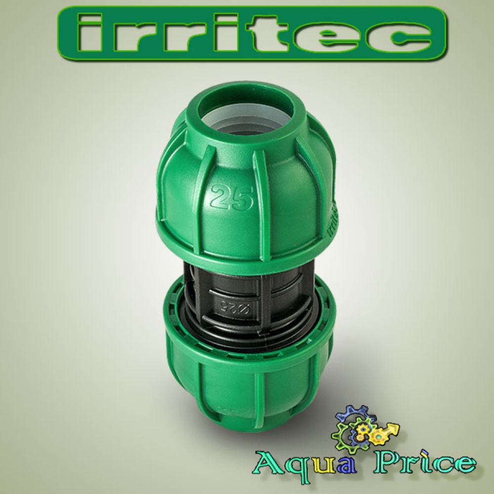 Діаметр вхідних частин розташованих по обидві сторони вироби, становить 25 мм. Виробляється компанією Irritec.Муфти для ПЕ-труб 25-25 мм витримують тиск в 10 бар, тому можуть застосовуватися в системах з невеликим напором води. Фіксація на трубах здійснюється за допомогою обтискних кілець, які додатково герметизовані за допомогою прокладок з гуми або поліпропілену. Кільце стискається вручну шляхом закручування. Сама конструкція розбірного типу, що допомагає швидко обслуговувати і замінювати деталі в цьому фітингу.
