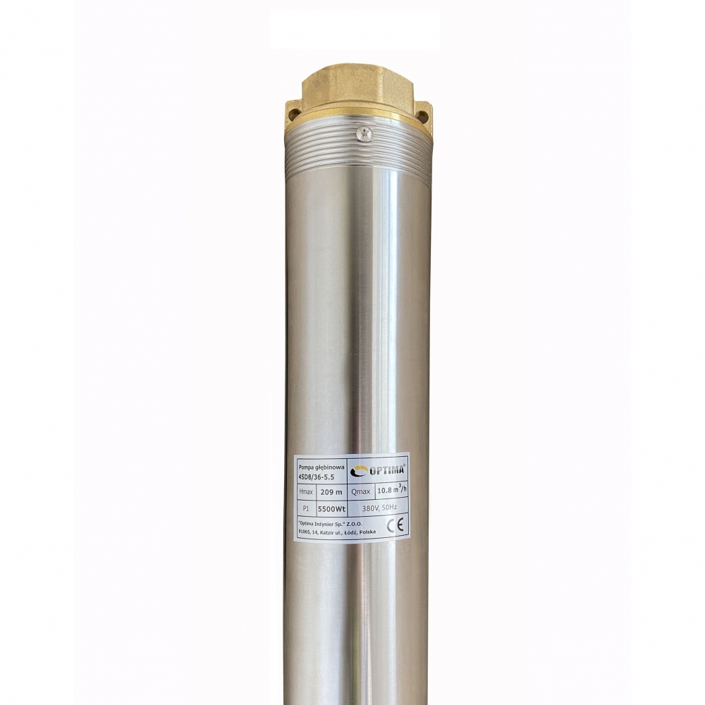 Насос OPTIMA 4SD8/36 5.5 кВт 209м 3-х фазний складається з двох частин: двигун у нижній частині та насос у верхній частині, жорстко з'єднані між собою зубчастою муфтою міжнародного стандарту Nema та має забір води у середній частині корпусу. Насос відноситься до насосів відцентрового типу і має багатоступінчасту конструкцію і «плаваючі» робочі колеса, завдяки яким реалізується підвищена стійкість до піску (до 2000 г/м3).