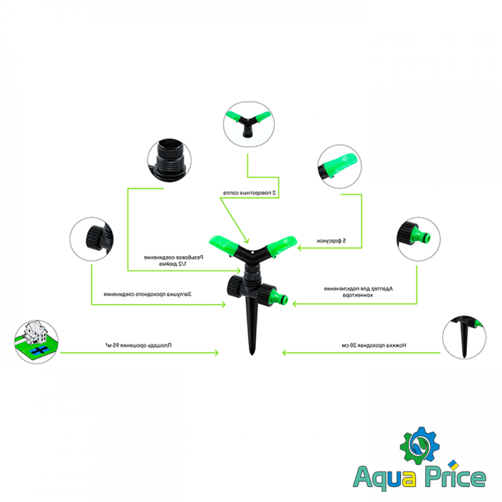 - Висока ефективність та рівномірність поливу;
