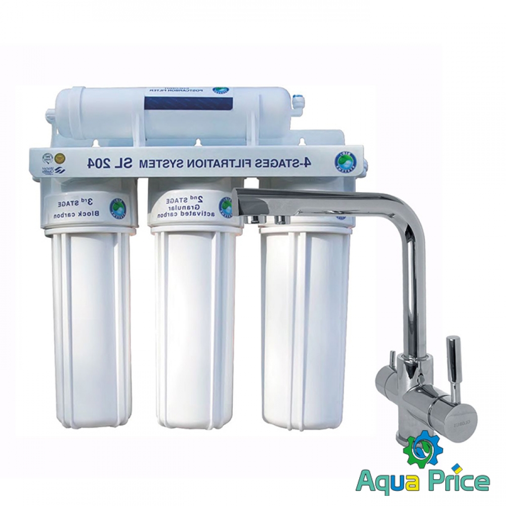 Полное название комплекса водоподготовки -система 4-х ступенчатой очистки воды SL204-GLLR-0888. Технологическая фильтро-схема удаления грязевых частиц из водопровода - проточная: без вымывания растворимых минералов, как это происходит в системах с осмотической мембраной.